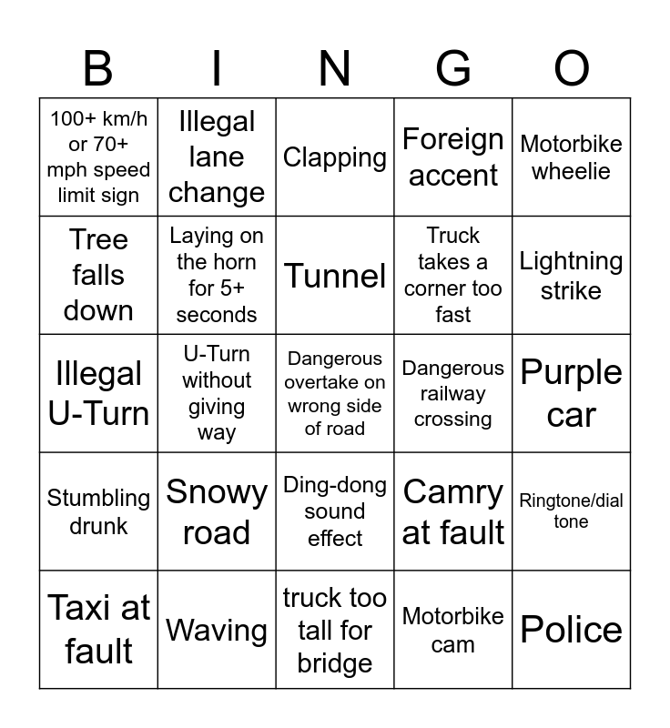 This bingo card has 128 words: Running a red, Illegal lane change, Tailgating, Brake smoke, Driving without headlights at night, Overloaded vehicle, Stumbling drunk, Car goes off the side of the road, Police, driverless car, Car stops suddenly in the middle of the road, jaywalking, Cyclist running a red, roof rack flies off a vehicle, Car almost hits a train at a railway crossing, Tire blowout, truck too tall for bridge, Pothole causes accident, Deer, Car loses bumper in crash, Ambulance struggles to get through traffic, Truck takes a corner too fast, Car gets stuck on train tracks, Bumper hanging off a car, Drives into a pole at low speed, Wrong side of road, Dangerous overtake on wrong side of road, Failing to give way to emergency vehicle, Not stopping at stop sign, Exiting/entering the highway last-minute, Illegal U-Turn, U-Turn without giving way, Brake check, Burnout, Not slowing down over speed bump, Vehicle driving over traffic island/median strip, Using emergency stopping lane to overtake, Road vehicle driving on footpath, Weaving through traffic at speed, Using the wrong lane to turn/go straight, Dangerous railway crossing, Cutting the corner when turning onto road, Instant karma, Student driver, Baby on board, Flooded road, Foggy road, Snowy road, Cammer at fault, Camry at fault, Company vehicle at fault, Taxi at fault, Cyclist at fault, Tesla at fault, Bus at fault, Emergency vehicle at fault, Train, Security/house cam, Sky cam, Literal dash cam, BYD cam, Tesla cam, Multiple dashcam angles (different drivers), Animal on the road, Road work ahead, 100+ km/h or 70+ mph speed limit sign, Vehicle with 12+ wheels (including trailers), Car-carrying truck/trailer, Lightning strike, Tree falls down, McDonald's, Purple car, Already damaged car, Aircraft, Custom license plate, Missing license plate, Good samaritan, Footage between midnight and 6am, Footage predates upload month by 2+ years, Reverse of shame, Motorbike cam, Motorbike wheelie, TRAKTOR, Reversing into another vehicle in traffic, Tunnel, Middle finger, Waving, High beam flashing, Caravan, Fire, Swearing, Someone says Dash cams, Ding-dong sound effect, Camera shutter sound effect, Dashcam/GPS voice, Screaming, Laughing, Clapping, Laying on the horn for 5+ seconds, Creative/rare insult, Foreign accent, Truck driver radio comms., You can name the song playing on the radio, Bass-boosted audio, Ringtone/dial tone, Audiobook, Driver on phone call, Head-on collision, Side-on collision, Rear-end collision, Rollover crash, Secondary Accident, Hit and run, Parking fail, Failed drift, Something falls off a vehicle, Road rage, Pedestrian walks in front of traffic, Accident involving 4+ vehicles, Trailer detaches from vehicle, Tyre falls off vehicle, Motorcyclist/cyclist falls over, Vehicle hits man-made object/building, Vehicle hits tree/plant, Fishtailing trailer, Vehicle loses control/spins out, Road vehicle goes airborne and Multiple faults in a single clip.