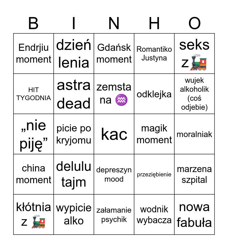 This bingo card has a free space and 24 words: delulu tajm, wypicie alko, zemsta na ♒️, kłótnia z 🚂, seks z🚂, Endrjiu moment, HIT TYGODNIA, dzień lenia, magik moment, depreszyn mood, odklejka, „nie piję”, przeziębienie, marzena szpital, astra dead, wodnik wybacza, moralniak, Gdańsk moment, wujek alkoholik (coś odjebie), picie po kryjomu, nowa fabuła, china moment, Romantiko Justyna and załamanie psychik.