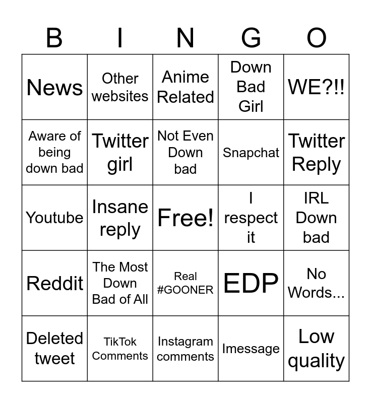 This bingo card has a free space and 24 words: The Most Down Bad of All, TikTok Comments, Not Even Down bad, Deleted tweet, WE?!!, News, Aware of being down bad, Other websites, I respect it, Real #GOONER, Snapchat, Youtube, EDP, No Words..., Twitter girl, Imessage, IRL Down bad, Anime Related, Twitter Reply, Insane reply, Low quality, Reddit, Down Bad Girl and Instagram comments.