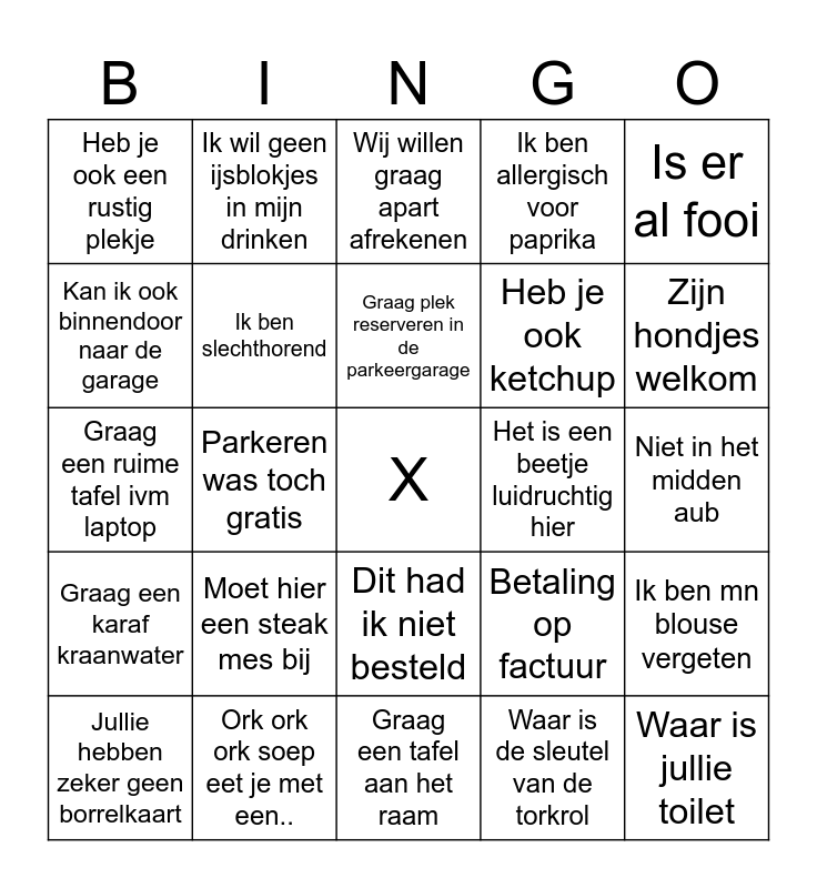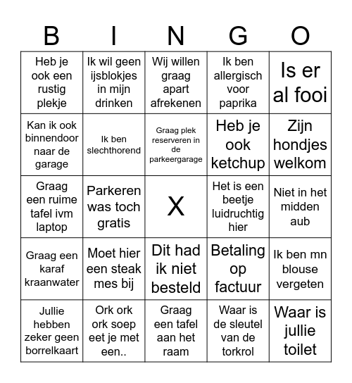 This bingo card has a free space and 56 words: Ik had nog friet besteld, Jullie hebben zeker geen borrelkaart, Waar kan ik de drankjes vinden, Heb je ook een rustig plekje, Graag een tafel aan het raam, We hebben een privé gesprek, Ik ben slechthorend, Het liefst in een booth, Heb je ook ketchup, Ik wist niet dat de steak tatare rauw is, Ik ben allergisch voor paprika, Ik ben allergisch voor knoflook, Ik heb niet de Amsterdamse gluten allergie, Wij hebben een zakelijke bespreking, Ik heb een zoom meeting, Ik ben allergisch voor gluten, Is er al fooi, Parkeren was toch gratis, Hoe kom ik bij de parkeergarage, Waar is jullie toilet, Het is een beetje luidruchtig hier, Het tocht hier, Betaling op factuur, Wij willen graag apart afrekenen, Het is een koud hier, Graag plek reserveren in de parkeergarage, Kan de muziek zachter, Kan ik met AMEX betalen, Zijn hondjes welkom, Ik ben allergisch voor noten, Moet ik weer ombouwen, We hebben haast, Ik heb niet gereserveerd, Mijn friet is koud, Niet in het midden aub, Kan ik ook binnendoor naar de garage, Graag een ruime tafel ivm laptop, Oh geen koekje bij de koffie, Graag een karaf kraanwater, Ik wil geen ijsblokjes in mijn drinken, Dit had ik niet besteld, Hebben jullie ook decaf, Jullie doen nooit iets op maandag, De plankjes bij de bar zijn vies, Groot bestek bij klein bestek, Moet hier een steak mes bij, Ork ork ork soep eet je met een.., Is er een stopcontact in de buurt, Wat is het wifi wachtwoord, Krijgen we ook nog brood, Waar is de sleutel van de torkrol, Tosti chorizo zonder chorizo graag, Keuken uuuuuit!!!!, Vergeet de admin kosten niet, Ik ben mn blouse vergeten and Hebben jullie ook iets glutenvrij.