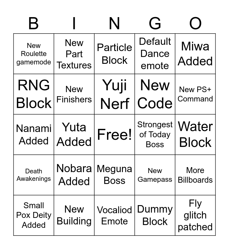 This bingo card has a free space and 24 words: Nobara Added, New Building, Yuji Nerf, Small Pox Deity Added, Miwa Added, New Roulette gamemode, RNG Block, New Part Textures, Strongest of Today Boss, Meguna Boss, New Code, Nanami Added, New Gamepass, More Billboards, New Finishers, Dummy Block, Water Block, Particle Block, New PS+ Command, Yuta Added, Fly glitch patched, Death Awakenings, Default Dance emote and Vocaliod Emote.