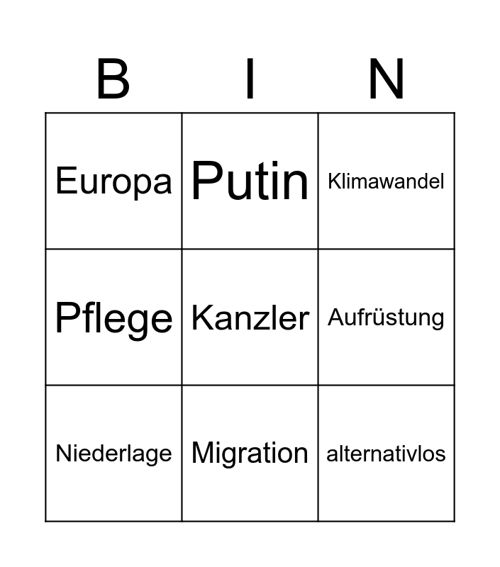 This bingo card has 33 words: Wahlergebnis, Gemeinsamkeit, Anspruch, kriminell, Wirtschaftswachstum, Niederlage, Kanzler, Trump, Putin, Ukraine, Migration, Klimawandel, Regierung, Schuldenbremse, Freiheit, Wohlstand, Verbote, Gespräch, Bundestag, Frieden, Verteidigung, Integration, Europa, Schulden, Investition, Vielen Dank für die Frage., Pflege, alternativlos, Aufrüstung, Sicherheit, Wirtschaft, Steuern and Entlastung.