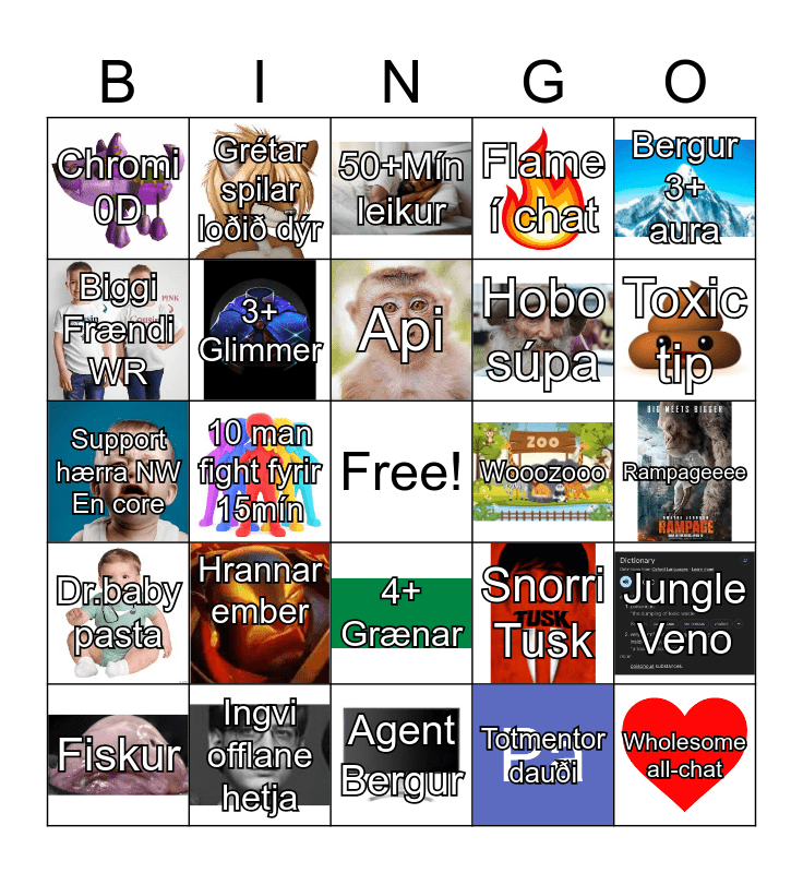 This bingo card has 24 images, a free space and 24 words: Hrannar ember, Ingvi offlane hetja, Api, Fiskur, Bergur 3+ aura, Chromi 0D, Biggi Frændi WR, Grétar spilar loðið dýr, Wooozooo, 4+ Grænar, Hobo súpa, Support hærra NW En core, Snorri Tusk, Jungle Veno, 3+ Glimmer, Totmentor dauði, Rampageeee, 50+Mín leikur, Toxic tip, 10 man fight fyrir 15mín, Wholesome all-chat, Dr.baby pasta, Flame í chat and Agent Bergur.