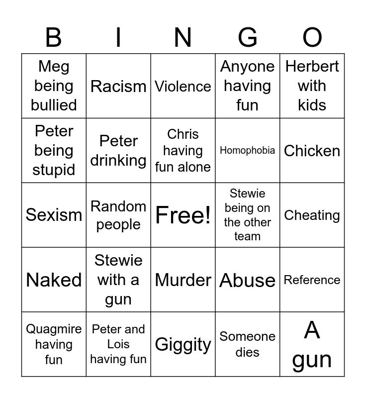 This bingo card has a free space and 24 words: Stewie with a gun, Peter and Lois having fun, Chris having fun alone, Quagmire having fun, Herbert with kids, Meg being bullied, Peter being stupid, Racism, Stewie being on the other team, Murder, Homophobia, Sexism, Abuse, Reference, Peter drinking, Someone dies, Cheating, Violence, Chicken, Random people, A gun, Naked, Anyone having fun and Giggity.