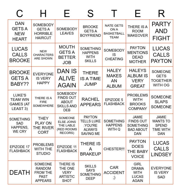 This bingo card has 49 words: PAYTON DOES THE BABY VOICE, PAYTON MENTIONS DEAD MOTHER, CAR ACCIDENT ;), THERE IS A FIRE SOMEWHERE, DAN IS ALIVE AGAIN, SOMEONE SLAPS SOMEONE, SOMEBODY GETS A HORRIBLE HAIRCUT, THERE IS THE ONE VERY ARTISTIC SHOT, THERE IS A ROOM MAKEOVER, PAYTON TELLS LUKE :YOU'RE ALWAYS SAVING ME, PARTY AND FIGHT, BROOKE GETS A BOYFRIEND, HALEYS ALBUM IS VERY GREAT, HALEY MAKES AN ALBUM, PROBLEMS WITH THE STUDIO, PROBLEMS WITH BROOKS COMPANY, LUCAS CALLS BROOKE, LUCAS CALLS PAYTON, LUCAS CALLS LINDSEY, NATE GETS ON A BASKETBALL TEAM, SOMEBODY IS CHEATING, SOMEBODY FINDS OUT ABOUT SKILLS AND DEB, DAN GETS A NEW HEART, NEW CHARACTERS ARE SHOWN, DEATH, MOUTH GETS A BETTER JOB, SOMEONE GETS TOGETHER WITH OG, SOMEONE RANDOM FROM THE PAST APPEARS, THERE IS A TIME JUMP, EVERYONE IS VERY HAPPY, EVERYONE IS VERY SAD, EPIZODE 5 FLASHBACK, EPIZODE 17 FLASHBACK, EPIZODE 11 FLASHBACK, LUKE'S TEAM WIN GAMES (AT LEAST 3), SOMETHING HAPPENS WITH Q, JAMIE FINDS OUT SOMETHING BAD ABOUT DAN, JAMIE WANTS TO SPEND TIME WITH DAN, BROOKE GETS A BABY??, SOMEONE ELSE JOINS THE LABLE (RED ROOMS RECORS), THERE IS A BRAKEUP, SOMETHING SAD HAPPENS, WE CRY, RACHEL APPEARS, SKILLS SAYS SOMETHING DEEP, SOMETHING HAPPENS WITH SKILLS, SOMEBODY LEAVES, CHESTER!!!, THEY PLAY ON THE RIVER CORT and GIRL DRAMA WITH LUCAS AGAIN.