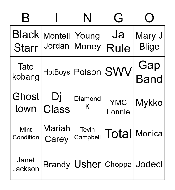 This bingo card has a free space and 24 words: Mariah Carey, Brandy, Poison, Janet Jackson, Mary J Blige, Black Starr, Tate kobang, Montell Jordan, YMC Lonnie, Tevin Campbell, SWV, Ghost town, Total, Monica, HotBoys, Choppa, Mykko, Young Money, Gap Band, Dj Class, Jodeci, Mint Condition, Ja Rule and Usher.