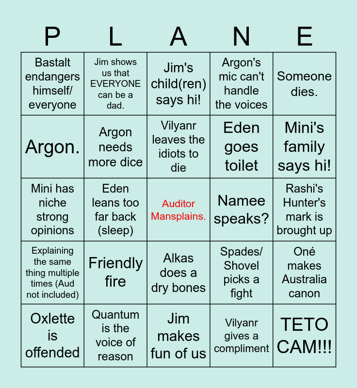 This bingo card has a free space and 24 words: Friendly fire, Quantum is the voice of reason, Vilyanr leaves the idiots to die, Oxlette is offended, Someone dies., Bastalt endangers himself/ everyone, Argon., Jim shows us that EVERYONE can be a dad., Namee speaks?, Alkas does a dry bones, Eden goes toilet, Mini has niche strong opinions, Spades/ Shovel picks a fight, Oné makes Australia canon, Argon needs more dice, Vilyanr gives a compliment, Rashi's Hunter's mark is brought up, Jim's child(ren) says hi!, Mini's family says hi!, Eden leans too far back (sleep), TETO CAM!!!, Explaining the same thing multiple times (Aud not included), Argon's mic can't handle the voices and Jim makes fun of us.