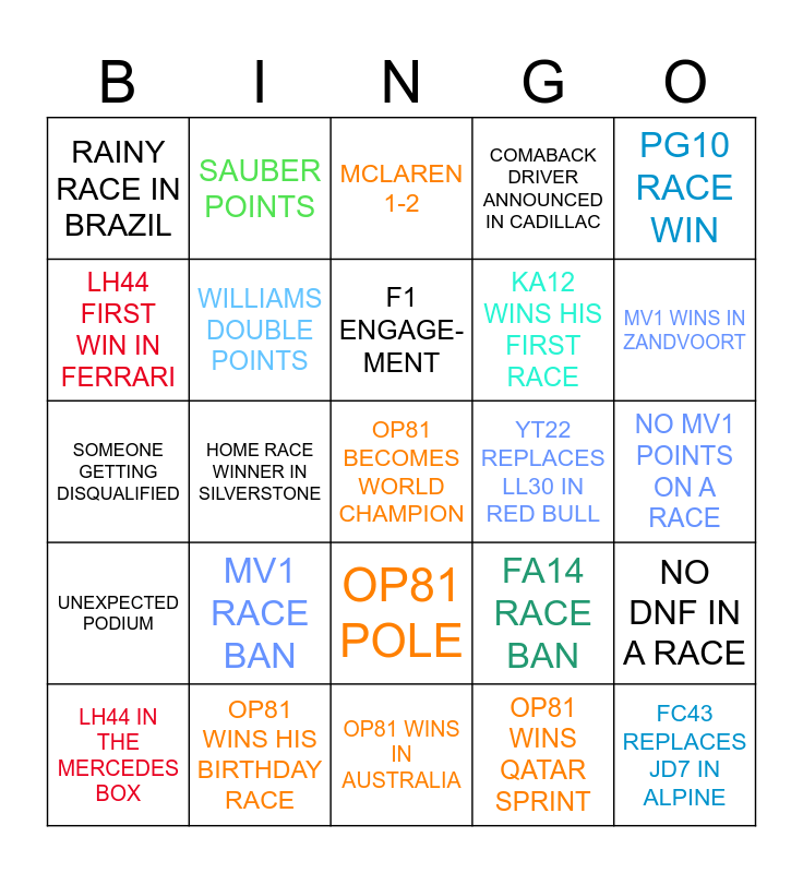 This bingo card has a free space and 24 words: MV1 RACE BAN, OP81 WINS HIS BIRTHDAY RACE, F1 ENGAGE-MENT, LH44 IN THE MERCEDES BOX, PG10 RACE WIN, RAINY RACE IN BRAZIL, LH44 FIRST WIN IN FERRARI, SAUBER POINTS, YT22 REPLACES LL30 IN RED BULL, OP81 POLE, KA12 WINS HIS FIRST RACE, SOMEONE GETTING DISQUALIFIED, FA14 RACE BAN, NO DNF IN A RACE, WILLIAMS DOUBLE POINTS, OP81 WINS QATAR SPRINT, NO MV1 POINTS ON A RACE, MCLAREN 1-2, MV1 WINS IN ZANDVOORT, HOME RACE WINNER IN SILVERSTONE, FC43 REPLACES JD7 IN ALPINE, UNEXPECTED PODIUM, COMABACK DRIVER ANNOUNCED IN CADILLAC and OP81 WINS IN AUSTRALIA.