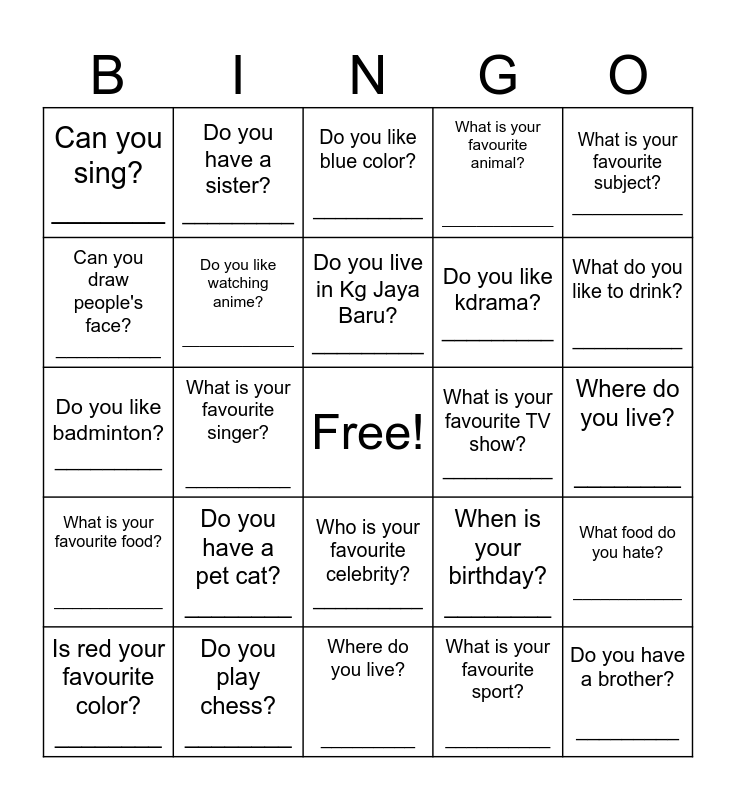 This bingo card has a free space and 24 words: Do you have a pet cat? ________, Do you play chess? ________, Do you live in Kg Jaya Baru? _________, Is red your favourite color? ________, What is your favourite subject? ___________, Can you sing? _______, Can you draw people's face? __________, Do you have a sister? _________, What is your favourite TV show? __________, Who is your favourite celebrity? __________, Do you like kdrama? _________, Do you like badminton? _________, When is your birthday? ________, What food do you hate? ____________, Do you like watching anime? _____________, What is your favourite sport? __________, Where do you live? ________, Do you like blue color? __________, What do you like to drink? __________, What is your favourite singer? __________, Do you have a brother? _________, What is your favourite food? ____________, What is your favourite animal? _____________ and Where do you live? _________.
