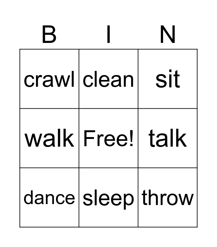 This bingo card has a free space and 12 words: catch, kick, throw, talk, clean, sit, sleep, read, crawl, walk, dance and shout.