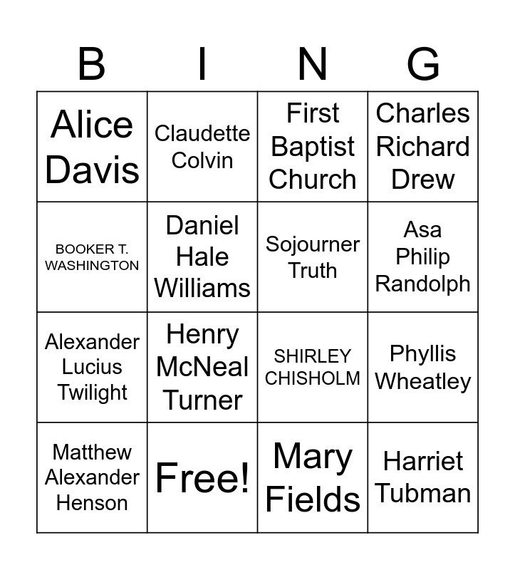 This bingo card has 16 words: Free!, Phyllis Wheatley, First Baptist Church, Alice Davis, Alexander Lucius Twilight, Claudette Colvin, SHIRLEY CHISHOLM, Mary Fields, BOOKER T. WASHINGTON, Daniel Hale Williams, Matthew Alexander Henson, Charles Richard Drew, Henry McNeal Turner, Asa Philip Randolph, Sojourner Truth and Harriet Tubman.