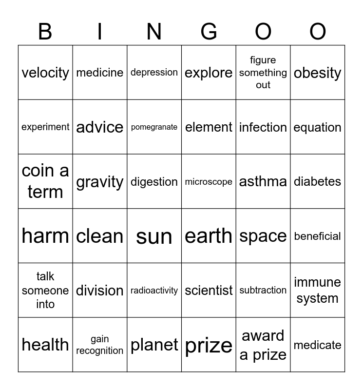 This bingo card has 42 words: award a prize, advice, allergy, asthma, beneficial, clean, coin a term, collaborate, depression, diabetes, digestion, element, equation, figure something out, gain recognition, harm, immune system, infection, medicate, medicine, obesity, radioactivity, talk someone into, velocity, win the respect, health, pomegranate, multiplication, division, subtraction, addition, microscope, experiment, space, planet, sun, earth, gravity, scientist, prize, explore and study.