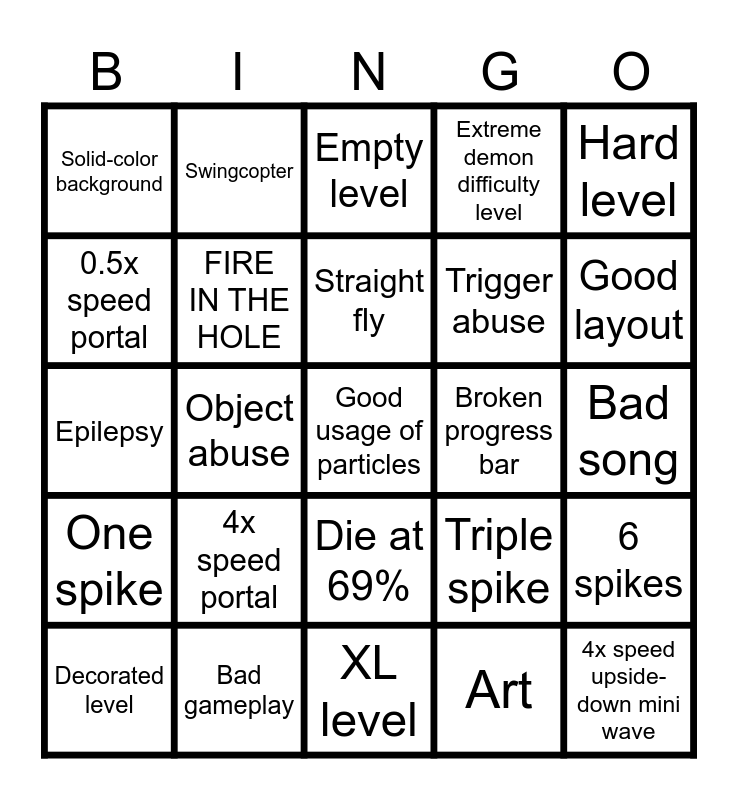 This bingo card has 25 words: 4x speed portal, XL level, Straight fly, Decorated level, Hard level, Solid-color background, 0.5x speed portal, Swingcopter, Broken progress bar, Die at 69%, Trigger abuse, Epilepsy, Triple spike, 6 spikes, FIRE IN THE HOLE, 4x speed upside-down mini wave, Bad song, Empty level, Good layout, Object abuse, Good usage of particles, Bad gameplay, One spike, Extreme demon difficulty level and Art.