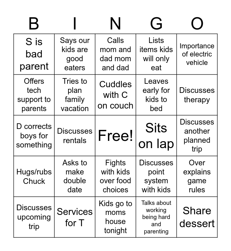 This bingo card has a free space and 29 words: Discusses upcoming trip, Works for God, Discusses rentals, New car, S is bad parent, Calls mom and dad mom and dad, Tries to plan family vacation, Asks to make double date, Sits on lap, Services for T, Discusses another planned trip, Share dessert, Kids go to moms house tonight, Talks about working being hard and parenting, Discusses therapy, Acts like the cool aunt, Fights with kids over food choices, Hugs/rubs Chuck, Importance of electric vehicle, D corrects boys for something, Discusses point system with kids, Complains about kids school always being off, Leaves early for kids to bed, Offers tech support to parents, Lists items kids will only eat, Says our kids are good eaters, Over explains game rules, Cuddles with C on couch and Ignores own children.