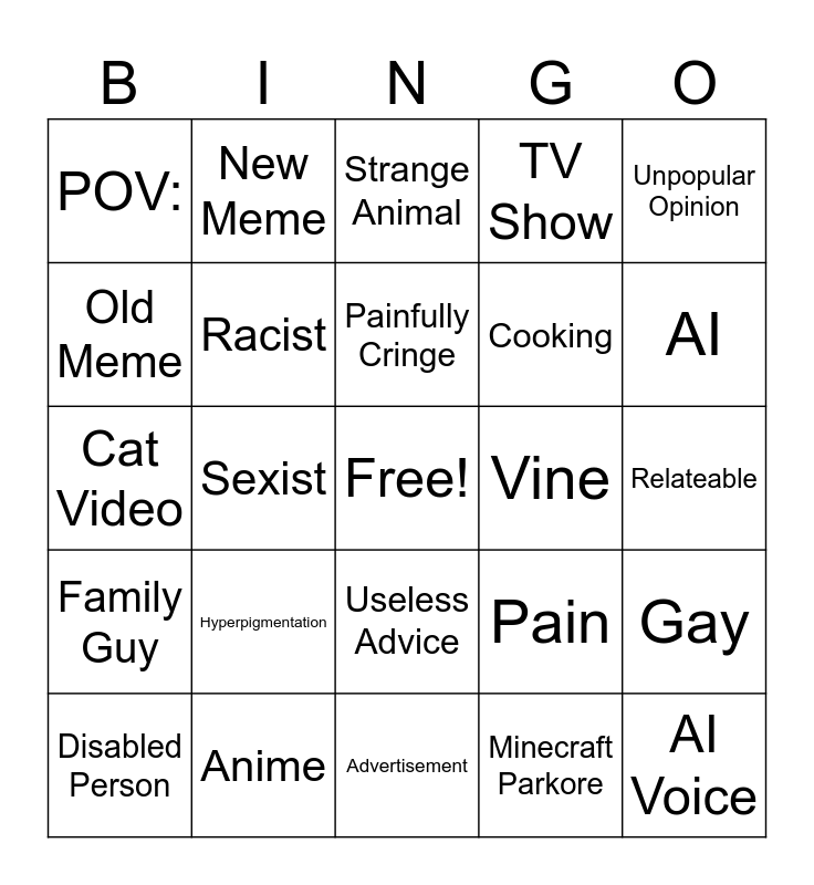 This bingo card has a free space and 24 words: Hyperpigmentation, Anime, Painfully Cringe, Disabled Person, Unpopular Opinion, POV:, Old Meme, New Meme, Vine, Useless Advice, Cooking, Cat Video, Pain, Gay, Racist, Minecraft Parkore, Relateable, Strange Animal, AI, Sexist, AI Voice, Family Guy, TV Show and Advertisement.