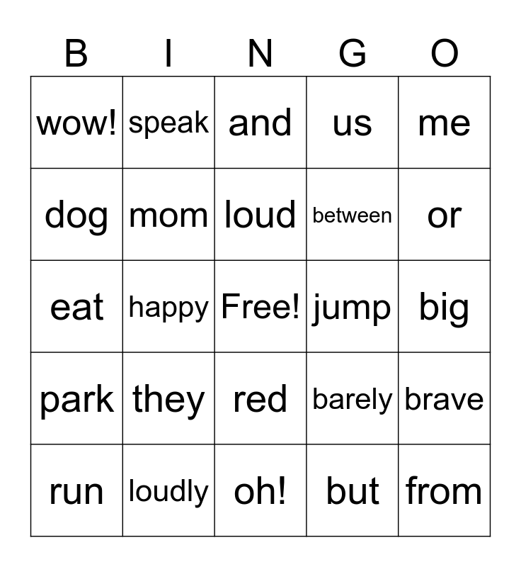 This bingo card has a free space and 29 words: run, quickly, happy, under, wow!, and, mom, they, jump, loudly, big, from, oh!, but, or, Yay!, red, park, me, eat, barely, to, between, dog, us, speak, brave, loud and softly.
