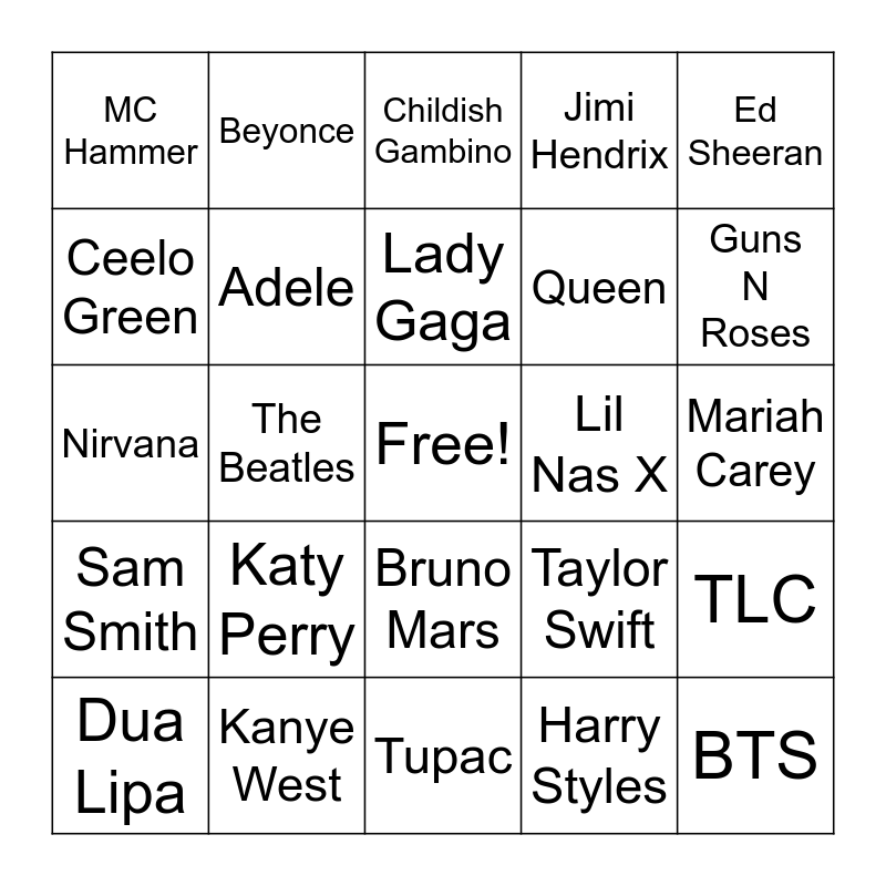 This bingo card has a free space and 27 words: Taylor Swift, Journey, Queen, Tupac, Ceelo Green, Childish Gambino, Beyonce, Sam Smith, Lil Nas X, TLC, Nirvana, Jimi Hendrix, Dua Lipa, Kanye West, Guns N Roses, Drake, Adele, Lady Gaga, Katy Perry, MC Hammer, Mariah Carey, Harry Styles, The Beatles, BTS, Bruno Mars, Ed Sheeran and Elton John.