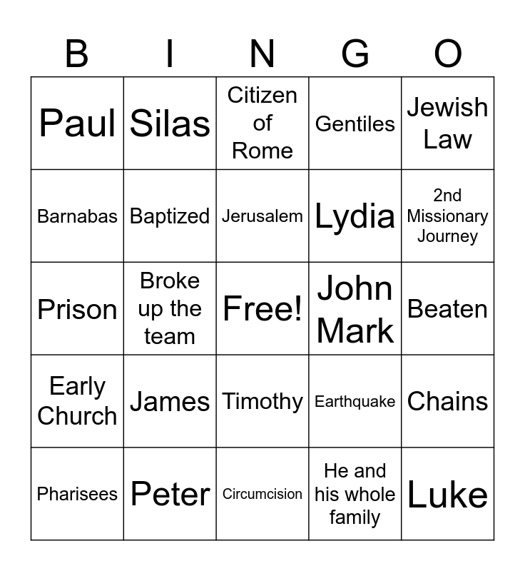 This bingo card has a free space and 24 words: James, Peter, Jerusalem, Pharisees, Jewish Law, Paul, Barnabas, Silas, John Mark, Timothy, Lydia, Prison, Earthquake, Chains, Baptized, He and his whole family, Beaten, Citizen of Rome, 2nd Missionary Journey, Broke up the team, Luke, Early Church, Gentiles and Circumcision.