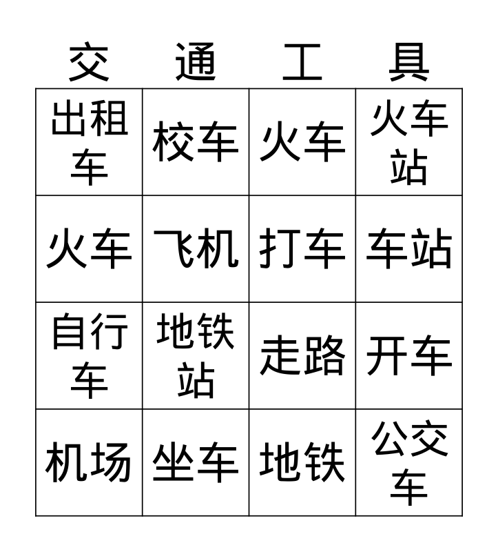 This bingo card has 16 words: 坐车, 开车, 火车, 出租车, 自行车, 校车, 走路, 地铁, 火车, 飞机, 机场, 火车站, 地铁站, 车站, 打车 and 公交车.