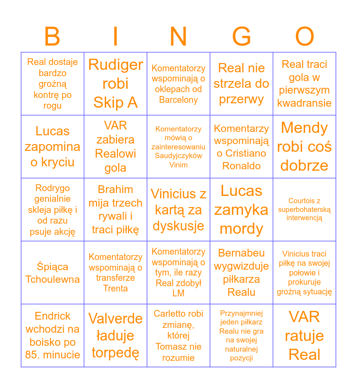 This bingo card has 26 words: Komentatorzy wspominają o tym, ile razy Real zdobył LM, Przynajmniej jeden piłkarz Realu nie gra na swojej naturalnej pozycji, Komentatorzy mówią o zainteresowaniu Saudyjczyków Vinim, Valverde ładuje torpedę, Real traci gola w pierwszym kwadransie, Real dostaje bardzo groźną kontrę po rogu, Lucas zapomina o kryciu, Rudiger robi Skip A, Courtois z superbohaterską interwencją, Bernabeu wygwizduje piłkarza Realu, Komentarzy wspominają o Cristiano Ronaldo, Rodrygo genialnie skleja piłkę i od razu psuje akcję, Vinicius traci piłkę na swojej połowie i prokuruje groźną sytuację, Endrick wchodzi na boisko po 85. minucie, Brahim mija trzech rywali i traci piłkę, Kylian na spalonym, Real nie strzela do przerwy, Śpiąca Tchoulewna, Komentatorzy wspominają o oklepach od Barcelony, Vinicius z kartą za dyskusje, Mendy robi coś dobrze, Carletto robi zmianę, której Tomasz nie rozumie, Lucas zamyka mordy, Komentatorzy wspominają o transferze Trenta, VAR zabiera Realowi gola and VAR ratuje Real.