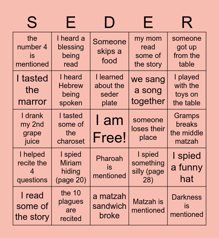 This bingo card has a free space and 28 words: I spied a funny hat, I ate some of the matzah, we sang a song together, Matzah is mentioned, I tasted the marror, Someone skips a food, I heard a blessing being read, I helped recite the 4 questions, someone loses their place, I read some of the story, I drank my 2nd grape juice, my mom read some of the story, the 10 plagues are recited, a matzah sandwich broke, I played with the toys on the table, I spied Elijah's cup (page 12-13), I spied Miriam hiding (page 20), I heard Hebrew being spoken, I learned about the seder plate, Pharoah is mentioned, the number 4 is mentioned, Frogs are mentioned, Darkness is mentioned, I tasted some of the charoset, Gramps breaks the middle matzah, I spied something silly (page 28), someone got up from the table and we all dip in salt water.