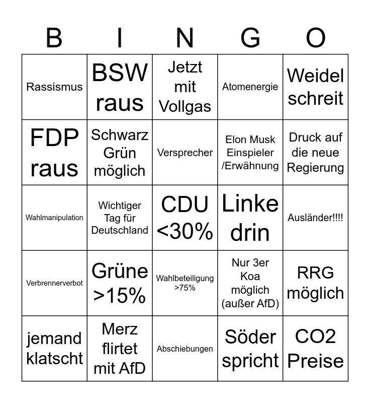This bingo card has a free space and 24 words: Grüne >15%, Merz flirtet mit AfD, Versprecher, jemand klatscht, Weidel schreit, Rassismus, FDP raus, BSW raus, Linke drin, Wahlbeteiligung >75%, Elon Musk Einspieler /Erwähnung, Wahlmanipulation, Nur 3er Koa möglich (außer AfD), RRG möglich, Schwarz Grün möglich, Söder spricht, Ausländer!!!!, Jetzt mit Vollgas, Druck auf die neue Regierung, Wichtiger Tag für Deutschland, CO2 Preise, Verbrennerverbot, Atomenergie and Abschiebungen.