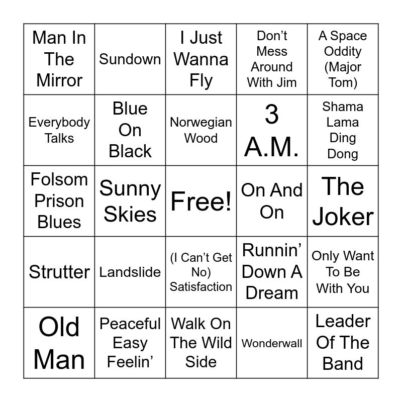 This bingo card has a free space and 40 words: Rocket Man, Folsom Prison Blues, Ventura Highway, Blue On Black, Peaceful Easy Feelin’, (I Can’t Get No) Satisfaction, Norwegian Wood, Comfortably Numb, A Space Oddity (Major Tom), Strutter, Sunny Skies, Don’t Mess Around With Jim, Leader Of The Band, The Joker, On And On, Landslide, Maneater, Man In The Mirror, Walking In Memphis, I Just Wanna Fly, Only Want To Be With You, Wonderwall, 3 A.M., Everybody Talks, Hey There Delilah, Gun Sale At The Church, People Are Crazy, Rhinestone Cowboy, Always On My Mind, Harvest Moon, Cats In The Cradle, Old Man, Rosie, Runnin’ Down A Dream, Shama Lama Ding Dong, Walk On The Wild Side, Margaritaville, Cherry Bomb, Sundown and Southern Cross.