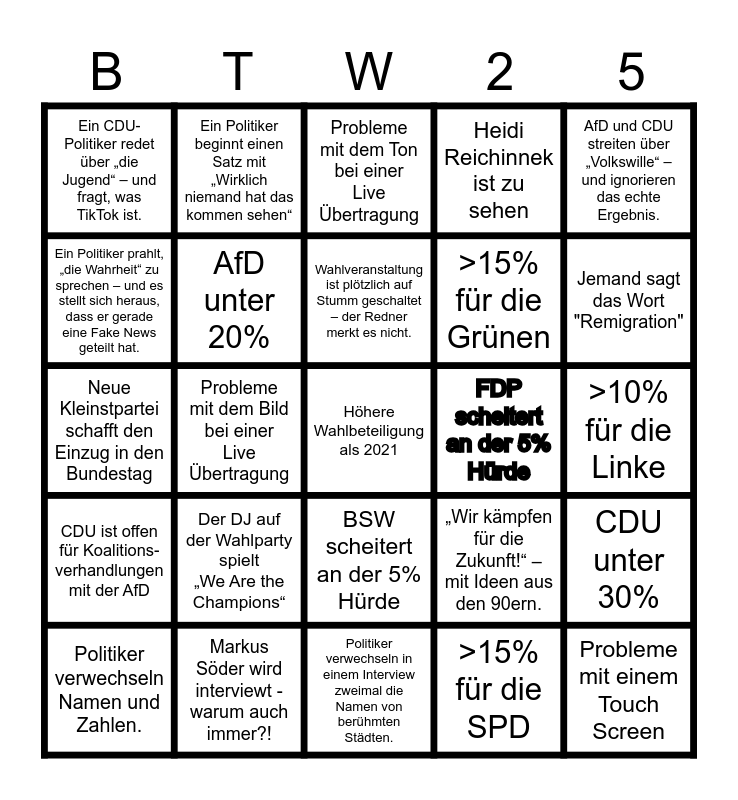 This bingo card has 25 words: Der DJ auf der Wahlparty spielt „We Are the Champions“, Politiker verwechseln in einem Interview zweimal die Namen von berühmten Städten., Wahlveranstaltung ist plötzlich auf Stumm geschaltet – der Redner merkt es nicht., Politiker verwechseln Namen und Zahlen., AfD und CDU streiten über „Volkswille“ – und ignorieren das echte Ergebnis., Ein CDU-Politiker redet über „die Jugend“ – und fragt, was TikTok ist., Ein Politiker prahlt, „die Wahrheit“ zu sprechen – und es stellt sich heraus, dass er gerade eine Fake News geteilt hat., Ein Politiker beginnt einen Satz mit „Wirklich niemand hat das kommen sehen“, FDP scheitert an der 5% Hürde, BSW scheitert an der 5% Hürde, >15% für die Grünen, Neue Kleinstpartei schafft den Einzug in den Bundestag, „Wir kämpfen für die Zukunft!“ – mit Ideen aus den 90ern., CDU unter 30%, AfD unter 20%, Probleme mit einem Touch Screen, >10% für die Linke, Probleme mit dem Ton bei einer Live Übertragung, Jemand sagt das Wort "Remigration", Probleme mit dem Bild bei einer Live Übertragung, Höhere Wahlbeteiligung als 2021, Markus Söder wird interviewt - warum auch immer?!, CDU ist offen für Koalitions-verhandlungen mit der AfD, Heidi Reichinnek ist zu sehen and >15% für die SPD.