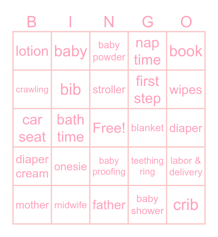 This bingo card has a free space and 36 words: Baby, Father, Mother, bib, teething ring, diaper cream, stroller, building blocks,, book, story time, bath time, nap time, bassinet, blanket, wipes, lotion, baby shampoo, onesie, crib, baby powder, diaper, labor & delivery, midwife, mother, father, baby, car seat, first word, first step, crawling, burp, baby socks, baby shower, baby proofing, nursery and rocking chair.