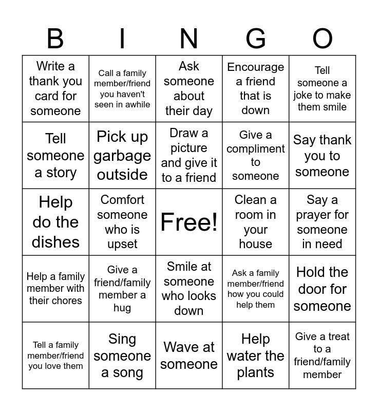 This bingo card has a free space and 24 words: Give a friend/family member a hug, Sing someone a song, Draw a picture and give it to a friend, Tell a family member/friend you love them, Tell someone a joke to make them smile, Write a thank you card for someone, Tell someone a story, Call a family member/friend you haven't seen in awhile, Clean a room in your house, Smile at someone who looks down, Give a compliment to someone, Help do the dishes, Ask a family member/friend how you could help them, Hold the door for someone, Pick up garbage outside, Help water the plants, Say a prayer for someone in need, Ask someone about their day, Say thank you to someone, Comfort someone who is upset, Give a treat to a friend/family member, Help a family member with their chores, Encourage a friend that is down and Wave at someone.