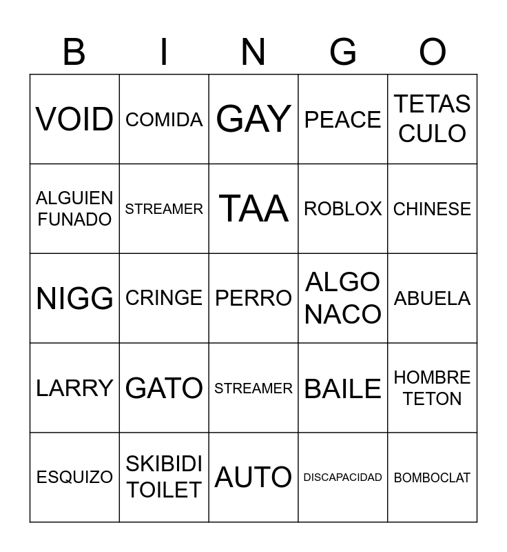 This bingo card has a free space and 24 words: GATO, SKIBIDI TOILET, TAA, ESQUIZO, TETAS CULO, VOID, ALGUIEN FUNADO, COMIDA, ALGO NACO, STREAMER, ROBLOX, NIGG, BAILE, HOMBRE TETON, STREAMER, DISCAPACIDAD, ABUELA, GAY, CHINESE, CRINGE, BOMBOCLAT, LARRY, PEACE and AUTO.