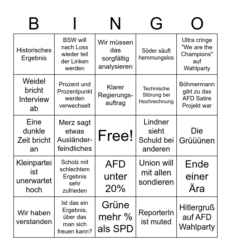 This bingo card has a free space and 24 words: Scholz mit schlechtem Ergebnis sehr zufrieden, Ist das ein Ergebnis, über das man sich freuen kann?, Klarer Regierungs-auftrag, Wir haben verstanden, Ultra cringe "We are the Champions" auf Wahlparty, Historisches Ergebnis, Weidel bricht Interview ab, BSW will nach Loss wieder teil der Linken werden, Lindner sieht Schuld bei anderen, AFD unter 20%, Technische Störung bei Hochrechnung, Eine dunkle Zeit bricht an, Union will mit allen sondieren, Ende einer Ära, Prozent und Prozentpunkt werden verwechselt, ReporterIn ist muted, Die Grüüünen, Wir müssen das sorgfältig analysieren, Böhmermann gibt zu das AFD Satire Projekt war, Merz sagt etwas Ausländer-feindliches, Hitlergruß auf AFD Wahlparty, Kleinpartei ist unerwartet hoch, Söder säuft hemmungslos and Grüne mehr % als SPD.