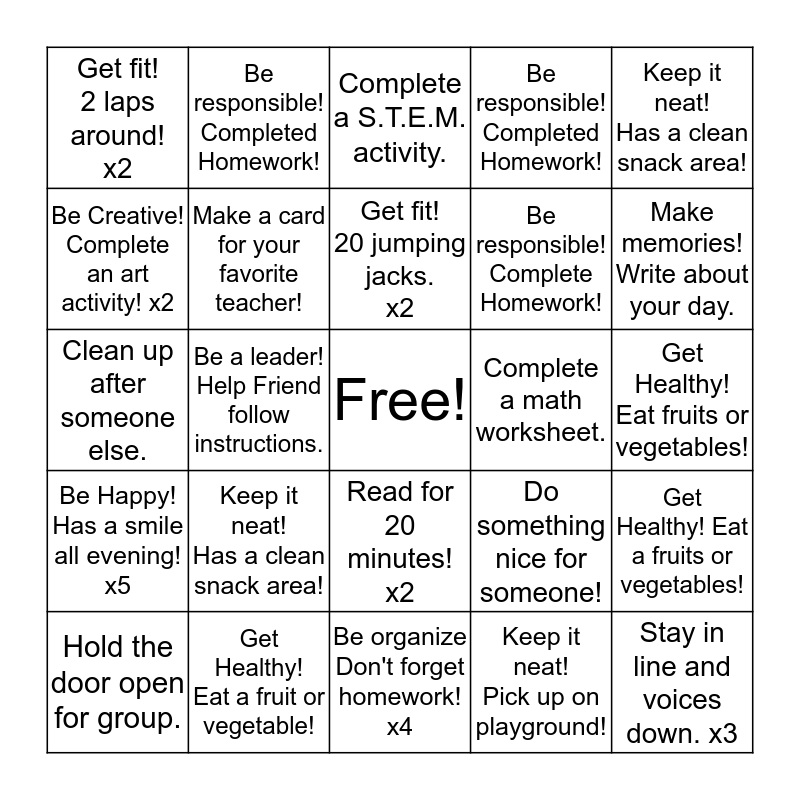 This bingo card has a free space and 24 words: Keep it neat! Has a clean snack area!, Get Healthy! Eat a fruit or vegetable!, Get fit! 20 jumping jacks. x2, Hold the door open for group., Keep it neat! Has a clean snack area!, Get fit! 2 laps around! x2, Be Creative! Complete an art activity! x2, Be responsible! Completed Homework!, Complete a math worksheet., Read for 20 minutes! x2, Be responsible! Complete Homework!, Clean up after someone else., Do something nice for someone!, Get Healthy! Eat a fruits or vegetables!, Make a card for your favorite teacher!, Keep it neat! Pick up on playground!, Get Healthy! Eat fruits or vegetables!, Complete a S.T.E.M. activity., Make memories! Write about your day., Be a leader! Help Friend follow instructions., Stay in line and voices down. x3, Be Happy! Has a smile all evening! x5, Be responsible! Completed Homework! and Be organize Don't forget homework! x4.