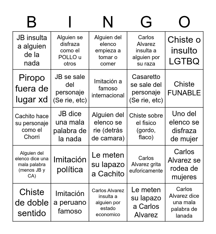 This bingo card has a free space and 24 words: Imitación política, Imitación a peruano famoso, Imitación a famoso internacional, Chiste de doble sentido, Chiste o insulto LGTBQ, JB insulta a alguien de la nada, Piropo fuera de lugar xd, Alguien se disfraza como el POLLO u otros, Chiste sobre el fisico (gordo, flaco), Le meten su lapazo a Cachito, Casaretto se sale del personaje (Se rie, etc), Cachito hace su personaje como el Chorri, Carlos Alvarez grita euforicamente, Carlos Alvarez se rodea de mujeres, JB se sale del personaje (Se rie, etc), Le meten su lapazo a Carlos Alvarez, Uno del elenco se disfraza de mujer, Alguien del elenco empieza a tomar o comer, Chiste FUNABLE, JB dice una mala palabra de la nada, Carlos Alvarez dice una mala palabra de lanada, Alguien del elenco dice una mala palabra (menos JB y CA), Carlos Alvarez insulta a alguien por su raza and Carlos Alvarez insulta a alguien por estado economico.