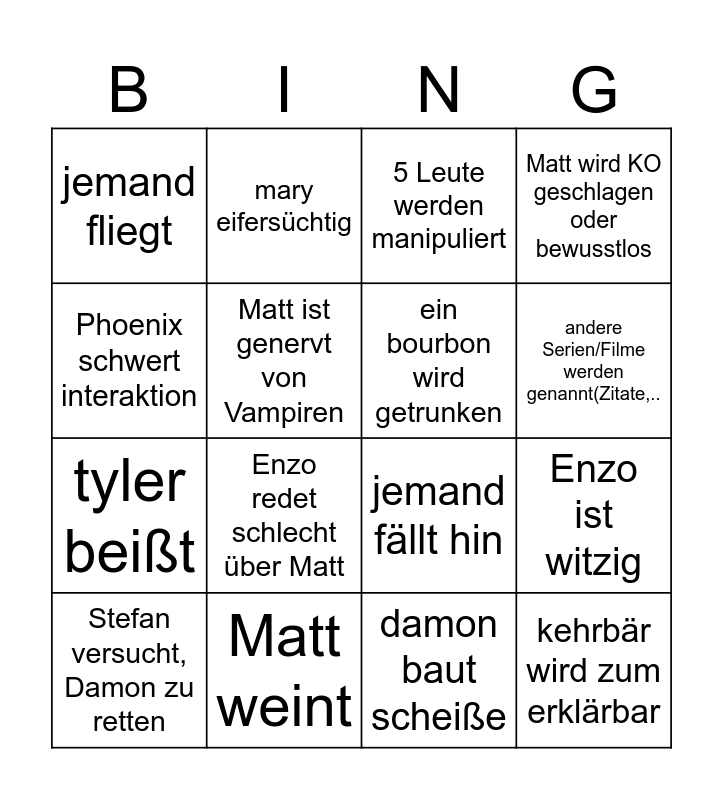 This bingo card has 16 words: Matt weint, Enzo ist witzig, 5 Leute werden manipuliert, jemand fliegt, tyler beißt, mary eifersüchtig, jemand fällt hin, damon baut scheiße, Phoenix schwert interaktion, Matt ist genervt von Vampiren, Stefan versucht, Damon zu retten, Matt wird KO geschlagen oder bewusstlos, Enzo redet schlecht über Matt, andere Serien/Filme werden genannt(Zitate,.., ein bourbon wird getrunken and kehrbär wird zum erklärbar.