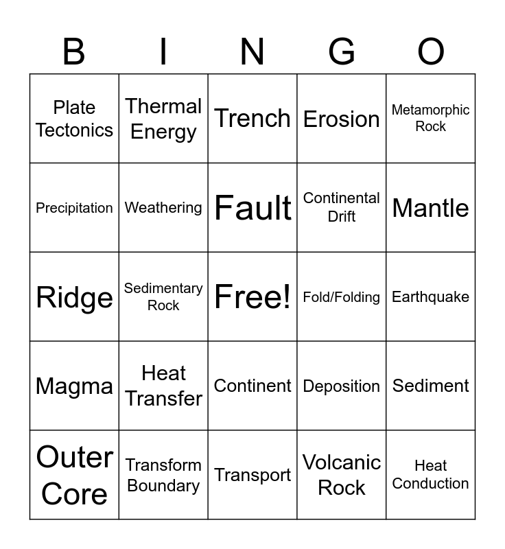 This bingo card has a free space and 49 words: Collide, Heat Conduction, Transform, Transport, Heat Transfer, Heat Radiation, Thermal Energy, Heat Convection, Precipitation, Volcanic Eruption, Weathering, Erosion, Sediment, Deposition, Rock Cycle, Ice Wedge, Fault, Fold/Folding, Igneous Rock, Metamorphic Rock, Sedimentary Rock, Volcanic Rock, Plate Tectonics, Continental Drift, Crust, Mantle, Outer Core, Inner Core, Continent, Magma, Lava, Subduction Zone, Convergent Boundary, Divergent Boundary, Transform Boundary, Hot Spot, Tsunami, Hurricane, Earthquake, Tornado, Fracture, Compressing, Sea Floor Spreading, Layer, Ridge, Trench, Plateau, Slope and Landslides.