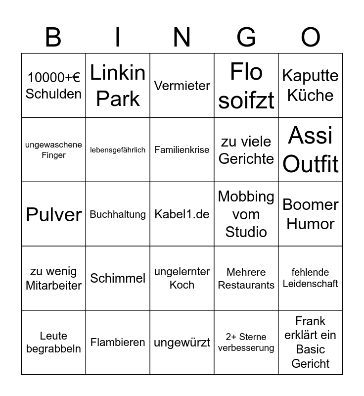 This bingo card has a free space and 24 words: Schimmel, Flambieren, Familienkrise, Leute begrabbeln, Kaputte Küche, 10000+€ Schulden, ungewaschene Finger, Linkin Park, Mobbing vom Studio, ungelernter Koch, zu viele Gerichte, Pulver, Mehrere Restaurants, fehlende Leidenschaft, lebensgefährlich, 2+ Sterne verbesserung, Boomer Humor, Vermieter, Assi Outfit, Buchhaltung, Frank erklärt ein Basic Gericht, zu wenig Mitarbeiter, Flo soifzt and ungewürzt.