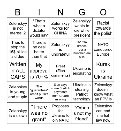 This bingo card has a free space and 24 words: The "guarantees" aren't putin's words, "There was no grant", Zelenskyy is ungrateful, Zelenskyy is a clown, Racist towards the polish, Zelenskyy is not eternal 2, Tries to stop the 15$ billion aid due, "That's what a dictator would say", Ukraine is escalating, Elon says some Starlink payments from UA are missing, The 267 drones russia launched are a lie, Written in ALL CAPS, Ukraine is stealing Patriot tecnology, Zelenskyy doesn't know what an FPV is, There is no deal better than that, "Orban is not my friend", Kursk is Ukraine, Zelenskyy works for CHINA, NATO conquered Europe, My approval is 70+%, Zelenskyy can end martial law now, Zelenskyy is young and stupid, Zelenskyy wants to die while president and Proposes for Ukraine to join NATO.