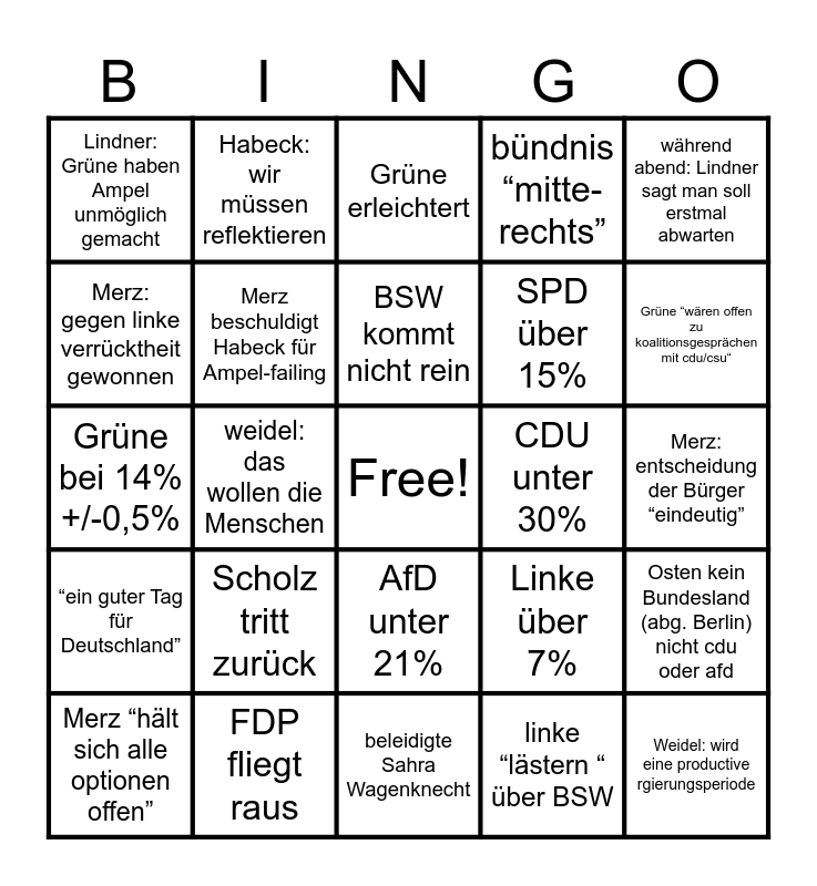 This bingo card has a free space and 24 words: Scholz tritt zurück, FDP fliegt raus, BSW kommt nicht rein, Merz “hält sich alle optionen offen”, während abend: Lindner sagt man soll erstmal abwarten, Lindner: Grüne haben Ampel unmöglich gemacht, Merz: gegen linke verrücktheit gewonnen, Habeck: wir müssen reflektieren, CDU unter 30%, AfD unter 21%, SPD über 15%, Grüne bei 14% +/-0,5%, Linke über 7%, Osten kein Bundesland (abg. Berlin) nicht cdu oder afd, Merz beschuldigt Habeck für Ampel-failing, linke “lästern “ über BSW, Merz: entscheidung der Bürger “eindeutig”, Grüne erleichtert, Grüne “wären offen zu koalitionsgesprächen mit cdu/csu“, weidel: das wollen die Menschen, Weidel: wird eine productive rgierungsperiode, “ein guter Tag für Deutschland”, bündnis “mitte-rechts” and beleidigte Sahra Wagenknecht.