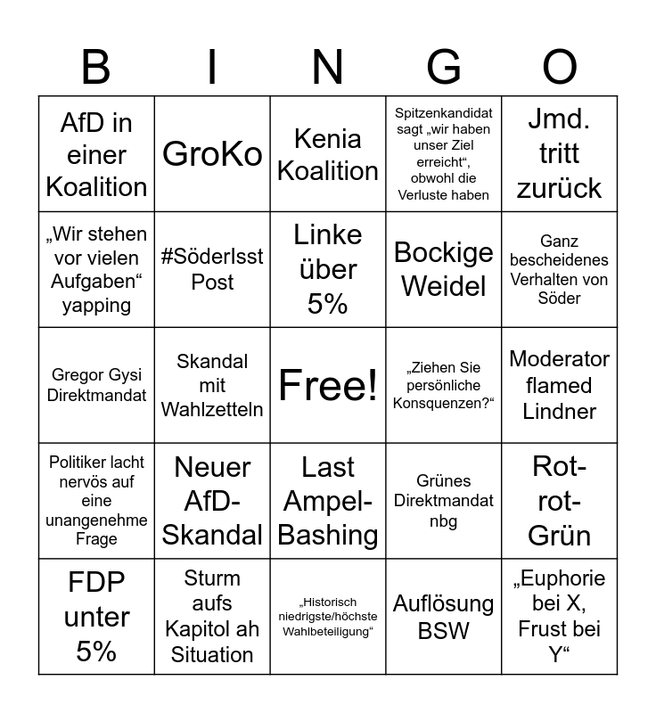 This bingo card has a free space and 24 words: Neuer AfD-Skandal, Sturm aufs Kapitol ah Situation, Linke über 5%, FDP unter 5%, Jmd. tritt zurück, AfD in einer Koalition, „Wir stehen vor vielen Aufgaben“ yapping, GroKo, „Ziehen Sie persönliche Konsquenzen?“, Last Ampel-Bashing, Bockige Weidel, Gregor Gysi Direktmandat, Grünes Direktmandat nbg, Rot-rot-Grün, #SöderIsst Post, Auflösung BSW, Moderator flamed Lindner, Kenia Koalition, Ganz bescheidenes Verhalten von Söder, Skandal mit Wahlzetteln, „Euphorie bei X, Frust bei Y“, Politiker lacht nervös auf eine unangenehme Frage, Spitzenkandidat sagt „wir haben unser Ziel erreicht“, obwohl die Verluste haben and „Historisch niedrigste/höchste Wahlbeteiligung“.