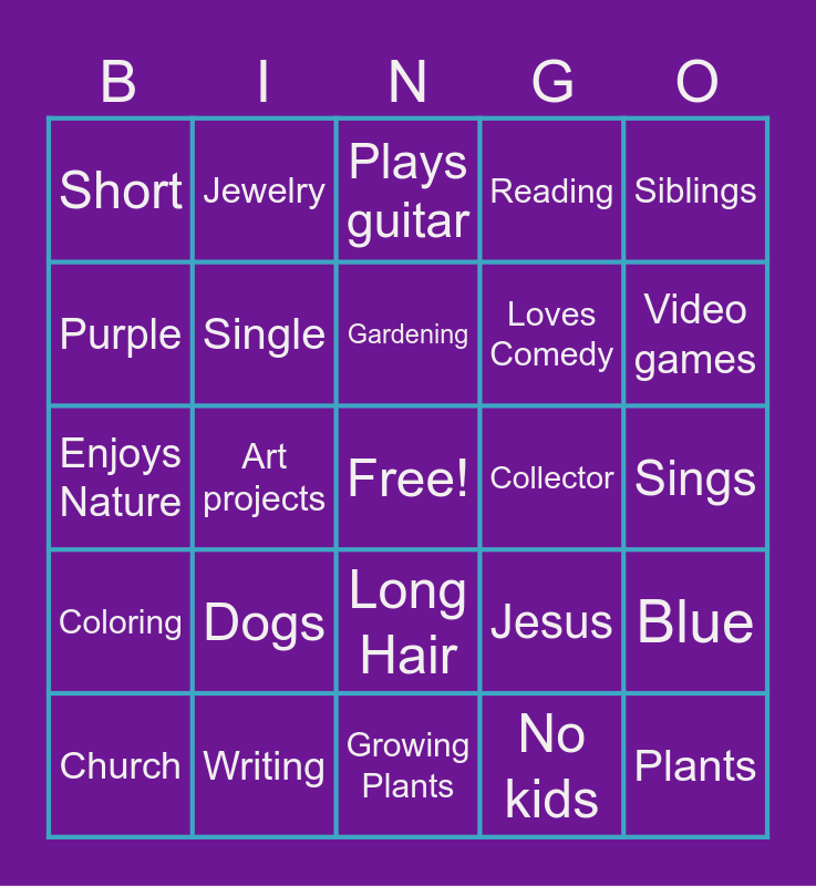 This bingo card has a free space and 24 words: Dogs, Writing, Gardening, Church, Siblings, Short, Purple, Jewelry, Collector, Long Hair, Loves Comedy, Enjoys Nature, Jesus, Blue, Single, No kids, Sings, Plays guitar, Video games, Art projects, Plants, Coloring, Reading and Growing Plants.