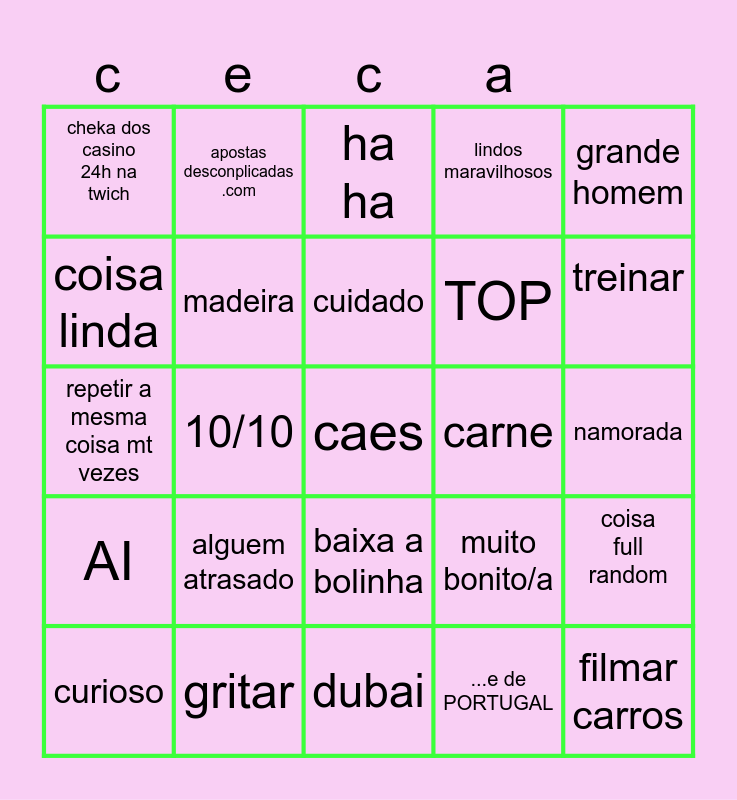 This bingo card has 30 words: gritar, windoh/numeiro, 10/10, cabelo fdd, cheka dos casino 24h na twich, ha ha, madeira, baixa a bolinha, carne, dubai, namorada, caes, ...e de PORTUGAL, filmar carros, treinar, asneiras, muito bonito/a, AI, alguem atrasado, grande homem, repetir a mesma coisa mt vezes, respeita o pai, apostas desconplicadas .com, TOP, coisa linda, lindos maravilhosos, coisa full random, curioso, cuidado and mi leva.