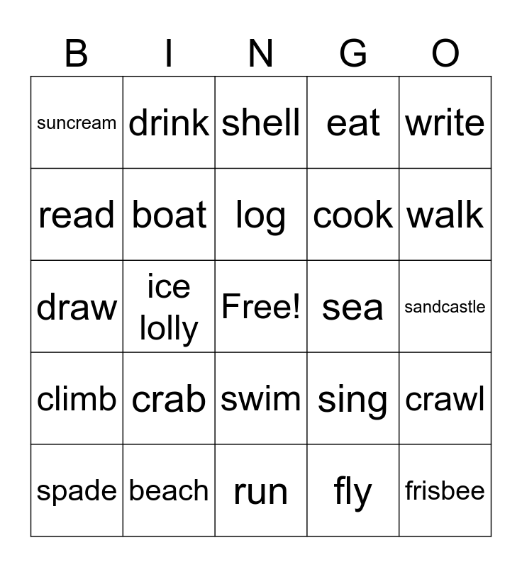 This bingo card has a free space and 29 words: spade, bucket, ice lolly, bat, suncream, shell, boat, crab, sea, beach, sandcastle, frisbee, run, fly, walk, talk, swim, climb, write, draw, sing, dance, cook, read, eat, drink, crawl, log and fox.