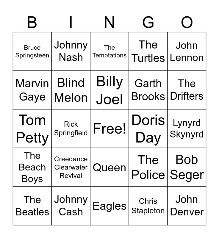 This bingo card has a free space and 29 words: The Beatles, Goo Goo Dolls, Rick Springfield, Elvis Presley, Bruce Springsteen, The Temptations, Blind Melon, Creedance Clearwater Revival, Doris Day, Johnny Cash, Lynyrd Skynyrd, John Denver, Eagles, Chris Stapleton, The Drifters, Amy Winehouse, Queen, The Beach Boys, John Lennon, Tom Petty, The Police, James Taylor, Garth Brooks, Marvin Gaye, The Turtles, Johnny Nash, Bob Seger, Billy Joel and Mariah Carey.