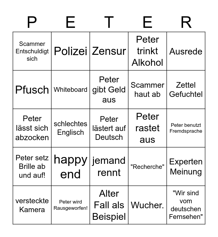This bingo card has 25 words: Peter setz Brille ab und auf!, Peter wird Rausgeworfen!, Peter lästert auf Deutsch, Wucher., Ausrede, Scammer Entschuldigt sich, Polizei, Zensur, Peter rastet aus, Experten Meinung, Pfusch, Whiteboard, Alter Fall als Beispiel, "Recherche", Zettel Gefuchtel, versteckte Kamera, schlechtes Englisch, Peter gibt Geld aus, Scammer haut ab, Peter benutzt Fremdsprache, Peter lässt sich abzocken, happy end, jemand rennt, Peter trinkt Alkohol and "Wir sind vom deutschen Fernsehen".