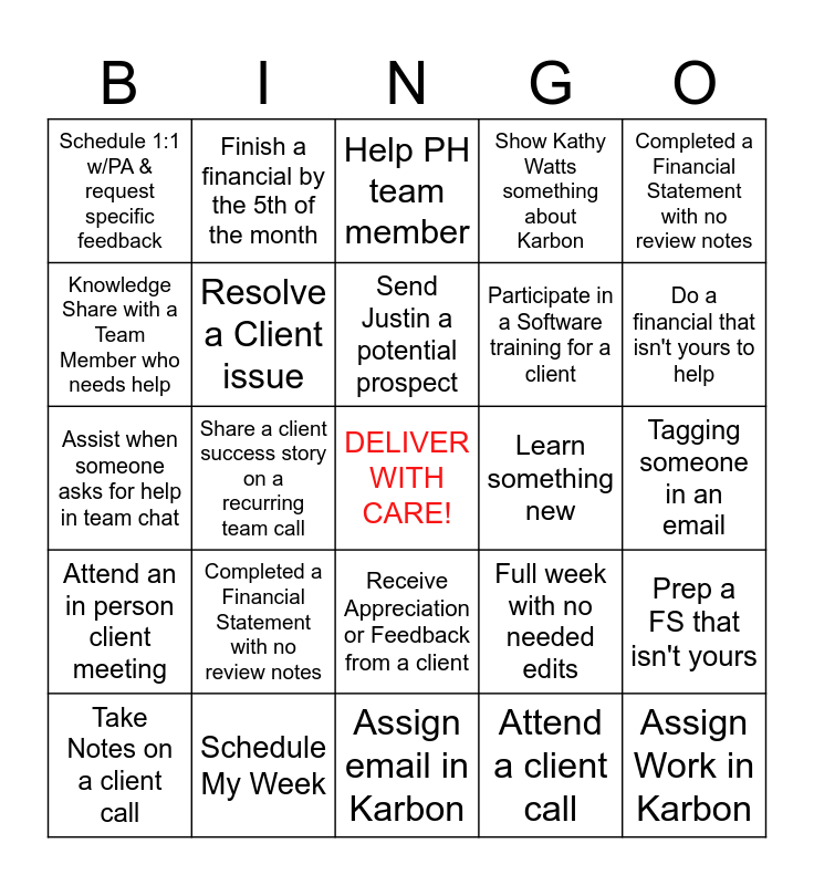This bingo card has a free space and 29 words: Take Notes on a client call, Help an Intern, Share a client success story on a recurring team call, Assist with processing for your client*, Schedule 1:1 w/PA & request specific feedback, Help PH team member, Resolve a Client issue, Completed a Financial Statement with no review notes, Learn something new, Schedule My Week, Tagging someone in an email, Assign Work in Karbon, Assign email in Karbon, Attend a client call, Do a financial that isn't yours to help, Knowledge Share on Team or POD Call, Receive Appreciation or Feedback from a client, Attend an in person client meeting, Completed a Financial Statement with no review notes, Assist when someone asks for help in team chat, Full week with no needed edits, Finish a Financial by the 5th, Participate in a Software training for a client, Knowledge Share with a Team Member who needs help, Show Kathy Watts something about Karbon, Finish a financial by the 5th of the month, Prep a FS that isn't yours, Send Justin a potential prospect and Assist with a new client onboarding.