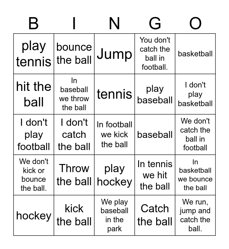 This bingo card has a free space and 24 words: Throw the ball, kick the ball, tennis, hockey, basketball, play tennis, hit the ball, bounce the ball, baseball, play hockey, play baseball, I don't play football, In tennis we hit the ball, In basketball we bounce the ball, In baseball we throw the ball, Catch the ball, We don't catch the ball in football, Jump, I don't play basketball, I don't catch the ball, We run, jump and catch the ball., We don't kick or bounce the ball., You don't catch the ball in football. and We play baseball in the park.