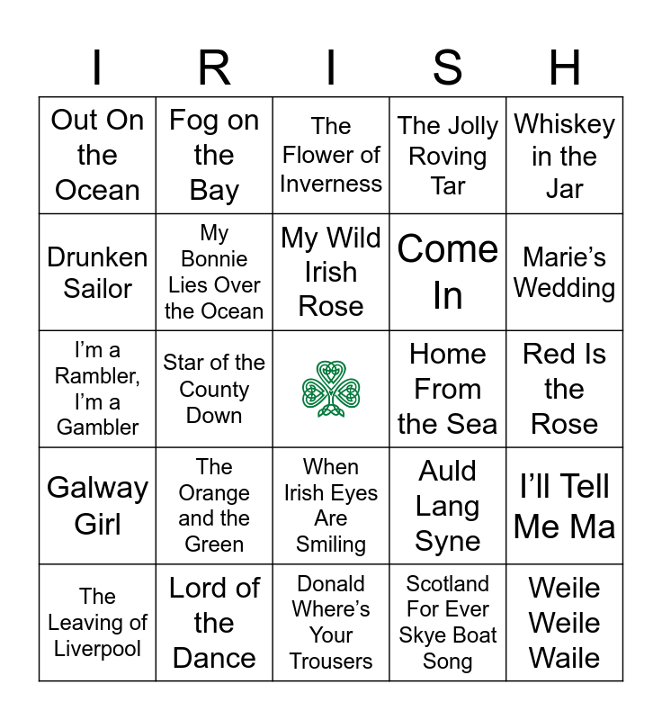 This bingo card has a free space and 27 words: Auld Lang Syne, The Bonnie Banks of Loch Lomond, Come In, Donald Where’s Your Trousers, Drunken Sailor, The Flower of Inverness, Fog on the Bay, Galway Girl, Home From the Sea, I’ll Tell Me Ma, I’m a Rambler, I’m a Gambler, The Jolly Roving Tar, The Leaving of Liverpool, Lord of the Dance, Marie’s Wedding, Molly Malone, My Bonnie Lies Over the Ocean, My Wild Irish Rose, The Orange and the Green, Out On the Ocean, Red Is the Rose, Scotland For Ever Skye Boat Song, Star of the County Down, Weile Weile Waile, When Irish Eyes Are Smiling, Whiskey in the Jar and Wild Mountain Thyme.