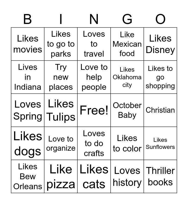 This bingo card has a free space and 24 words: Love to organize, Like pizza, Love to help people, Likes Bew Orleans, Likes Disney, Likes movies, Lives in Indiana, Likes to go to parks, October Baby, Loves to do crafts, Likes Oklahoma city, Loves Spring, Likes to color, Likes Sunflowers, Try new places, Loves history, Christian, Loves to travel, Likes to go shopping, Likes Tulips, Thriller books, Likes dogs, Like Mexican food and Likes cats.