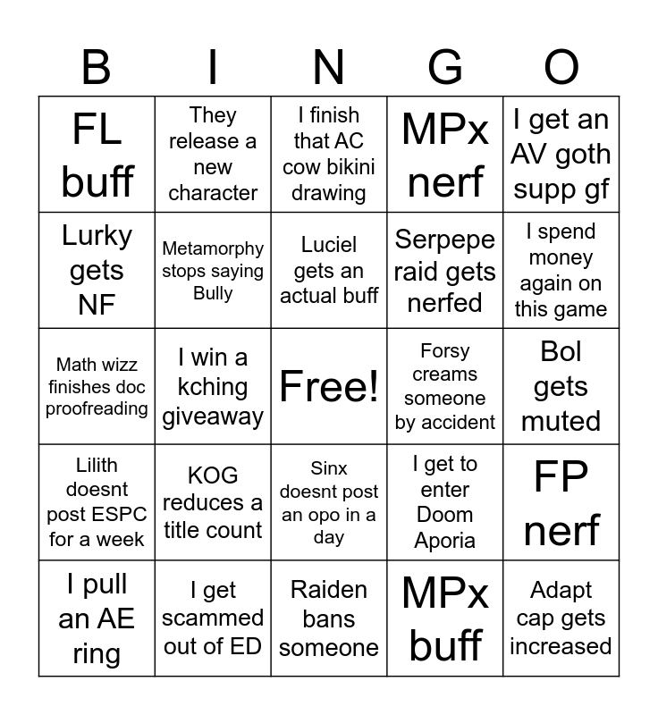 This bingo card has a free space and 24 words: KOG reduces a title count, I get scammed out of ED, Luciel gets an actual buff, I pull an AE ring, I get an AV goth supp gf, FL buff, Lurky gets NF, They release a new character, Forsy creams someone by accident, Sinx doesnt post an opo in a day, Serpepe raid gets nerfed, Math wizz finishes doc proofreading, I get to enter Doom Aporia, FP nerf, Metamorphy stops saying Bully, MPx buff, Bol gets muted, I finish that AC cow bikini drawing, I spend money again on this game, I win a kching giveaway, Adapt cap gets increased, Lilith doesnt post ESPC for a week, MPx nerf and Raiden bans someone.